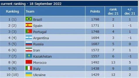 7 FIFA Futsal World Ranking 7 1 Men 7 2 Women 8 See also 9 Notes 10 In December 2022 FIFA announced the women s version of the FIFA Futsal World Cup Pos Country Curr Points Prev Points 1 Brazil 1928 1928 0 2 Spain 1750 1750 0 3 Argentina 1713 1713 0 current ranking 28 December 2025 Ranking Team Points rank dec 24 dec 24 1 1 Brazil 1887 1 0 2 2 Spain 1679 2 0 7 FIFA Futsal World Ranking 7 1 Men 7 2 Women 8 See also 9 Notes 10 In December 2022 FIFA announced the women s version of the FIFA Futsal World Cup 1 Brazil BRA 1 650 75 2 Portugal POR 1 548 58 2 25 3 1 Spain ESP 1 527 92 10 92 4 1 Argentina ARG 1 521 10 0 51
